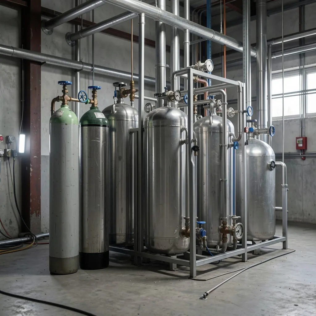 Газовые баллоны и криогенное оборудование делятся на три основные категории по типу хранимого вещества. Первая — баллоны для сжатых газов (воздух, азот, гелий, водород), рабочее давление в которых достигает 200–300 бар. Вторая категория — баллоны для сжиженных газов (пропан, бутан, углекислота, аммиак), где давление не превышает 25 бар, но объём жидкой фазы может составлять до 85% от геометрического.